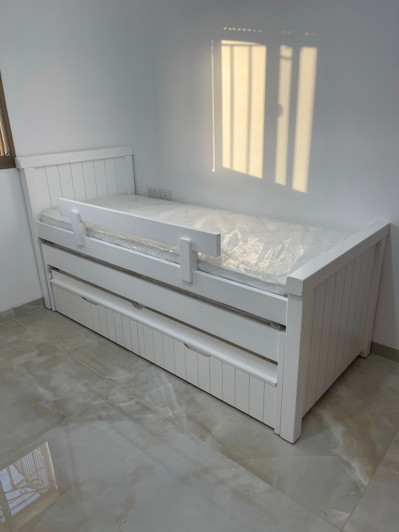 מיטת ילדים משולשת איכותית מעוצבת, עם מיטת חבר נשלפת.