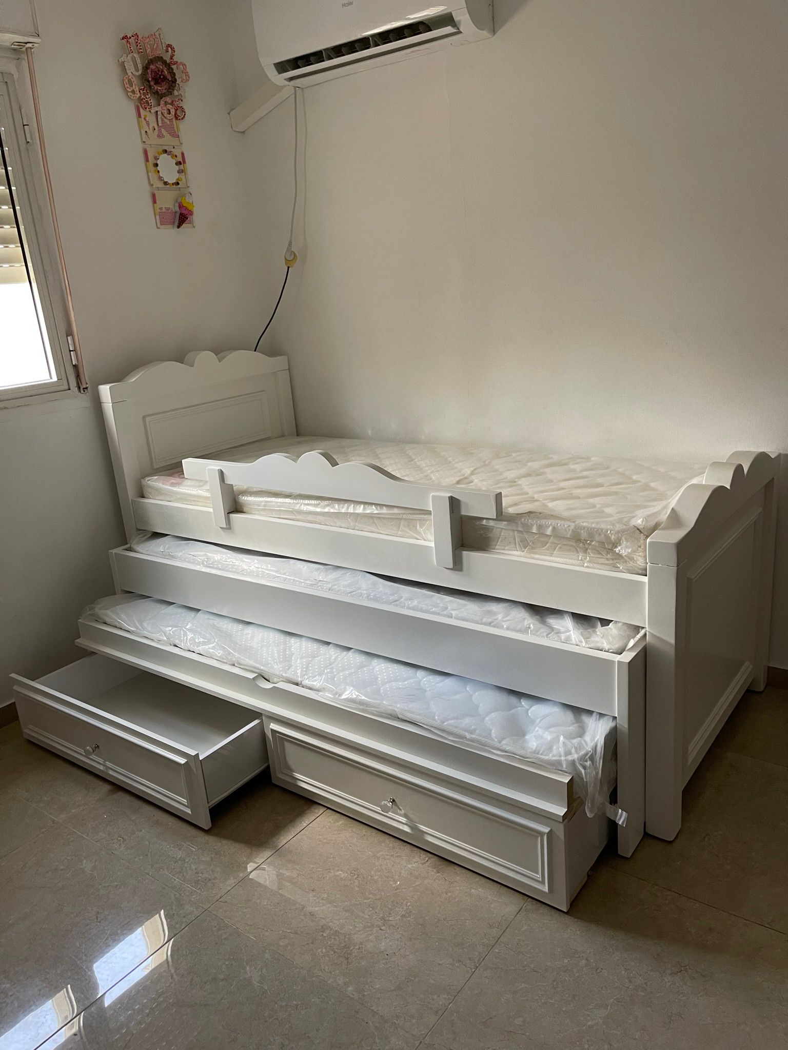 מיטת ילדים משולשת איכותית מעוצבת, עם מיטת חבר נשלפת.
